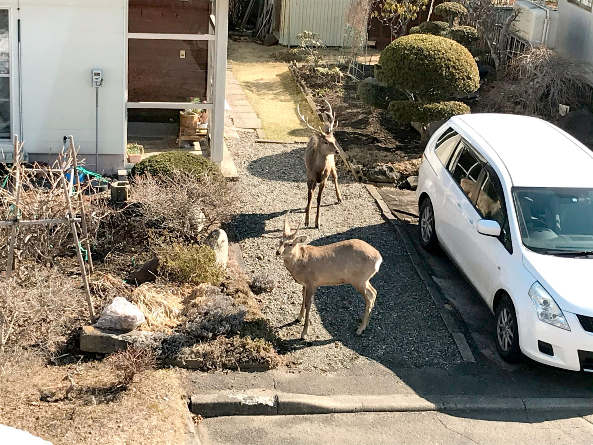 4月12日午前9時30分 隣家の庭にエゾシカの親子が...